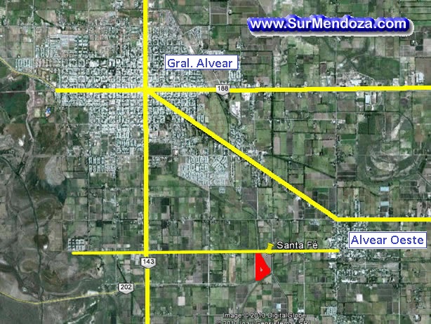 ![]() * Salimos del cruce de las rutas Nº188 y Nº143, centro de Gral. Alvear, donde hay una rotonda y el monumento al General Don José de San Martín. * Desde el cruce nos dirigimos hacia el sur por la ruta nacional Nº143, como yendo para Neuquén. Hacemos 2500m. * Allí doblamos a la izquierda (o sea al este) tomando la Calle Santa Fe y hacemos 1800m. A nuestra derecha vamos a encontrar el ingreso a la finca "Santa Fe II". |