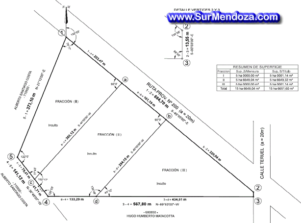 Este es un detalle del plano aprobado por Catastro, necesario para escriturar a nombre del nuevo dueño. Se pueden ver las medidas y superficies de cada fracción. |