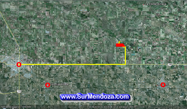 * Vamos a partir del cruce de las rutas Nº 188 y Nº 143, en General Alvear, donde hay una rotonda y el monumento al General Don José de San Martín. * Desde el cruce vamos el este por la Ruta Nac Nº188 como hacia BsAs. Hacemos 12Km exactos. Frenamos. * Allí, doblamos a la izquierda (o sea al norte) tomando la calle 16, que en un principio es asfaltada. Hacemos 2Km (los primeros 1200m son asfaltados y los 800m restantes son de ripio). Frenamos. * Doblamos a la izquierda (o sea al oeste) por la calle "G", que es de tierra y hacemos 1000m. A nuestra derecha vamos a encontrar el puente sobre el canal. Lo cruzamos y a nuestra derecha comienzan las fracciones, primero las 3 de "La Escondida" y luego las 5 de "La Escondida II". |