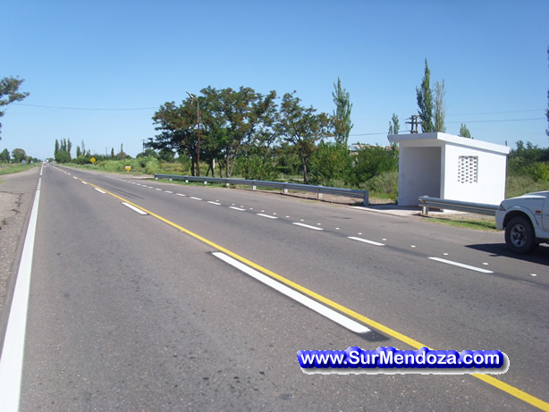 Esta foto de verano muestra la Ruta Nacional Nº188 haciendo esquina con la calle 16, como quien está llegando de BsAs. Para ir a la finca habría que doblar a la derecha, por atrás de esos árboles. Si siguiéramos derecho llegaríamos a Gral. Alvear, 12Km más adelante. |