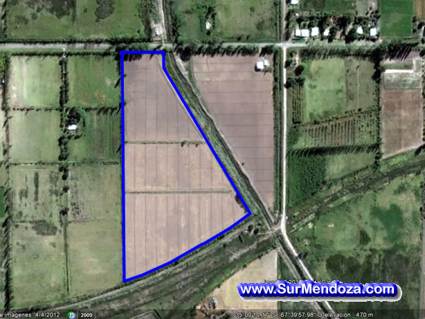 Esta foto es un acercamiento a la propiedad llamada "Santa Fe II", con sus límites en azul. De esta propiedad se desprende el Loteo "Santa Fe II" y la Finca "Santa Fe II". Al sur, abajo, la finca limita con la Calle L. Cruzando la calle hacia el sur, hacia abajo, están las vías del ferrocarril que hace años no está en marcha. |