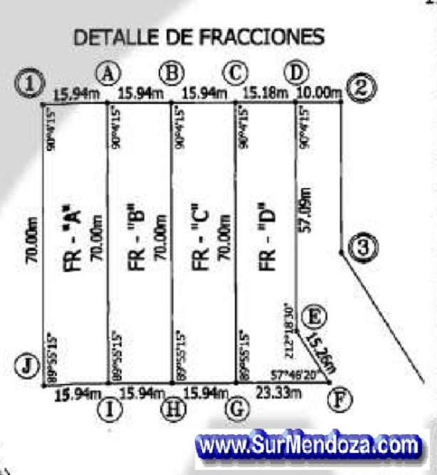 En el plano aprobado aparece este detalle de las medidas de los lotes. Aquí se amplía para una mejor visualización. El frente de cada una de los lotes, la Calle Santa Fe se encuentra al norte (arriba) de cada una de ellos. Quisiera hacer notar que existe un frente extra de 10m indicado en este detalle a la derecha del lote D, que corresponde a la entrada a la finca que se encuentra al sur (abajo) de los lotes. Este ancho "pasillo" fue reservado porque el plan completo es constituir en el futuro, sobre la finca "del fondo", un barrio cerrado. |