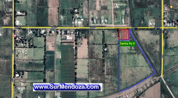 Vemos la cercanía a las rutas Nacionales Nº188 que va a BsAs (horizontal arriba) y la Nº143 que va a San Rafael hacia el norte y a Neuquén hacia el sur (vertical a la izquierda). La traza amarilla que va en diagonal es la famosa Avenida "Diagonal" Pellegrini (por sus frondosos y añejos álamos carolingios) y hacia el este y desde Colonia Alvear Oeste nace la Avenida Centenario que va a Bowen. La linea amarilla horizontal abajo, es la Calle Santa Fe sobre la cual están los lotes. |
